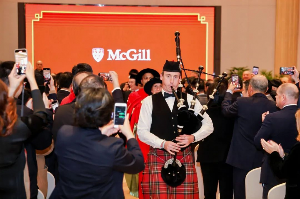 仪式以苏格兰风笛手吹奏的编曲拉开序幕,三首曲目巧妙切换:麦吉尔校歌追溯学术传统,苏格兰民谣致敬麦吉尔大学创始人的故乡情结,加上中国的《茉莉花》的演奏,带来既有独特风味的文化,更加上中国元素。风笛声中,校长Deep Saini率学术团队与包陪庆教授步入会场,完成跨越两个世纪的学术精神传承。