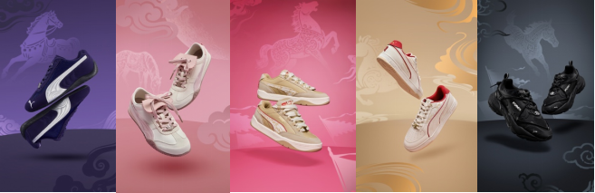 延续“骏马”奔腾的美好意象,本季鞋履系列从中国历史传奇人物的坐骑中汲取灵感,将五款经典鞋型凝炼为五款独特的“五骏迎春”:SPEEDCAT 以「飒露紫」的天骄之姿为设计灵感,采用静谧的紫霭配色体现别样的凌厉之美;BELLA UT 自带温润干净的辨识度,以清透粉色为主调,呈现「玉狮子」的灵动与秀气;PARK LIFESTYLE 将金棕底色叠加赤金纹理,呈现「赤兔」经典又热烈的双重气质;CAVEN III 则身披金缎,附着金黄流线构筑轻奢视觉,如同「黄骠马」般蹄踏流星;RS LITE 提炼墨色中的深邃气场,将「乌骓」的破局者身份展现地淋漓尽致。五骏齐驱,竞跃奔腾,PUMA 多样鞋履尽显先锋态度与美好寓意,激励年轻一代以骏马之激情、赛车之动力开启新程。