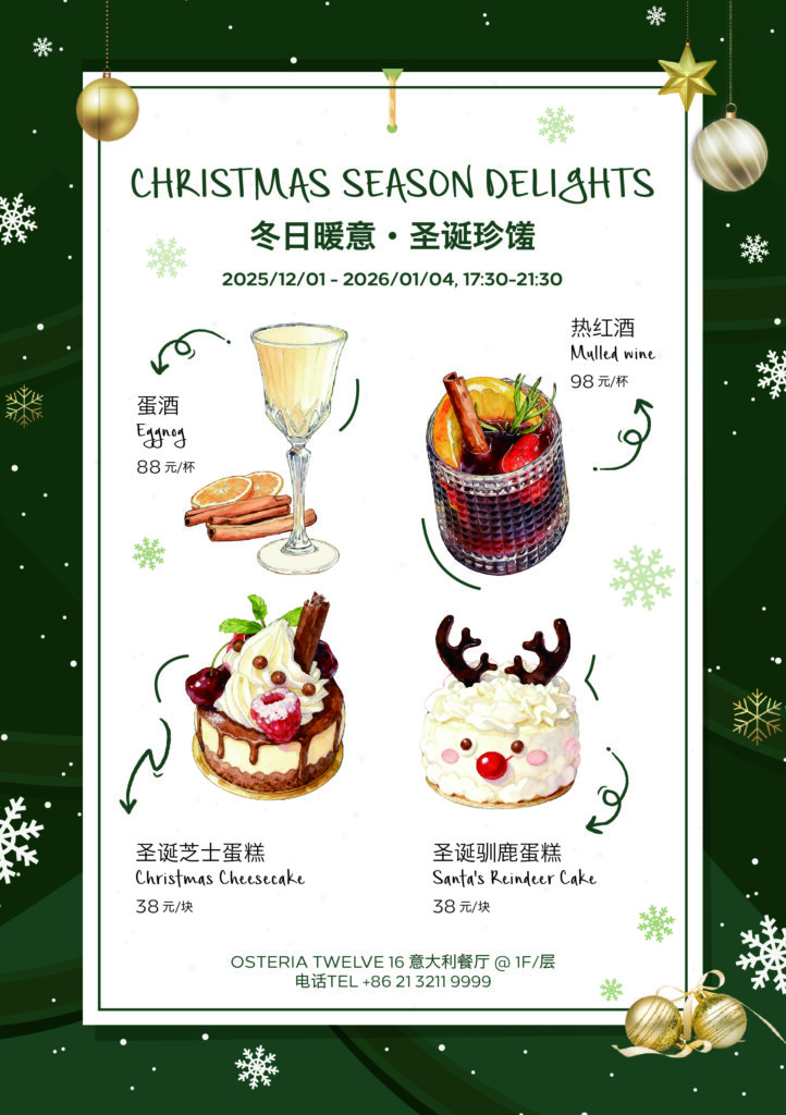 从黄昏到夜色渐深,香料萦绕的热红酒、绵滑浓郁的蛋酒,与圣诞限定蛋糕一同构成冬季最柔软的味觉记忆。无论是独自放松,或与好友小聚,这段“冬日序曲”都将在 Osteria Twelve 16 缓缓展开。有效期:2025 年 12 月1 日至 2026 年 1 月 4 日 17:30-21:30